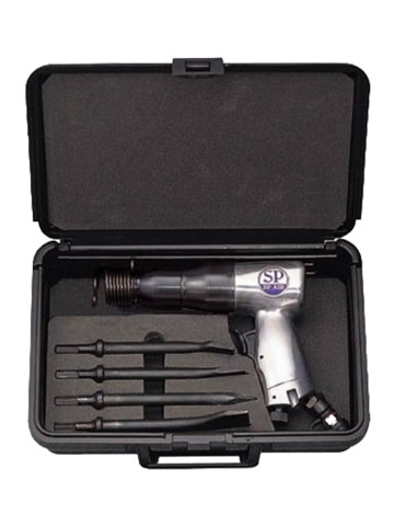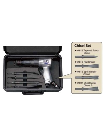 Kit includes: Air Hammer & 4pc Chisels Includes Tapered Puch Chisel, Flat Chisel, Spot Welder Chisel, Sheet Metal Chisel Free Speed 3000BPM Uses a hard steel cylinder Quick change retainer for quick chisel replacement Easy change retainer for quick accessory changing Attach each chisel to remove rust from mufflers and pipes, cut body panels, and peel off spot welds